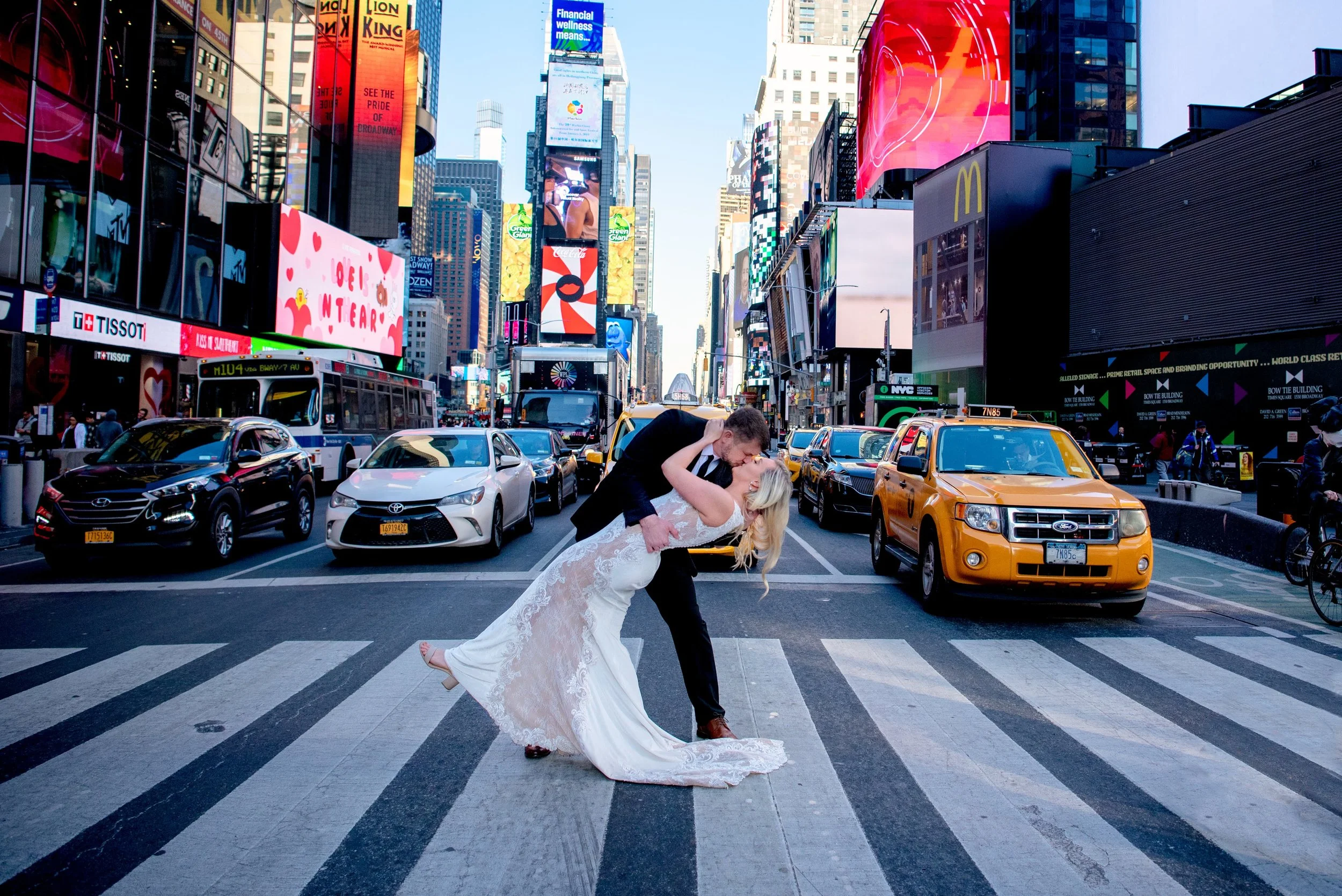 A newly married couple sharing a kiss in Times Square, New York City, with taxis, cars, pedestrians, and bright electronic billboards in the background.