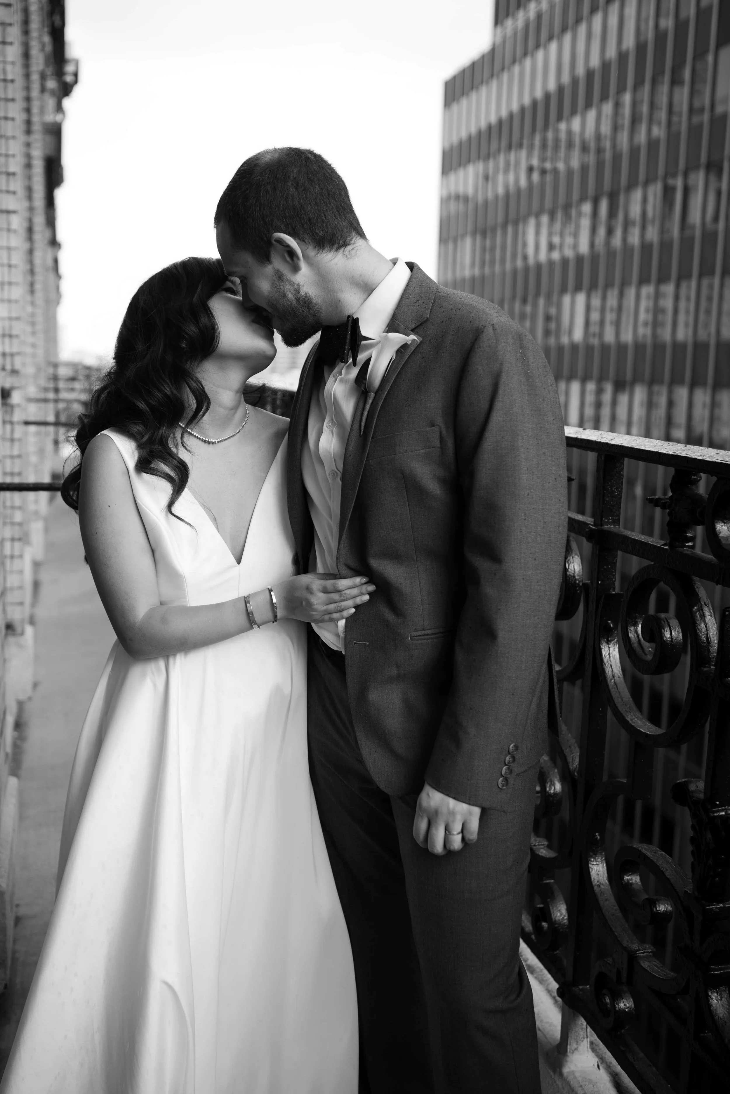 A black and white photo of a couple on a city rooftop balcony, about to kiss, with downtown buildings in the background. View fullsize