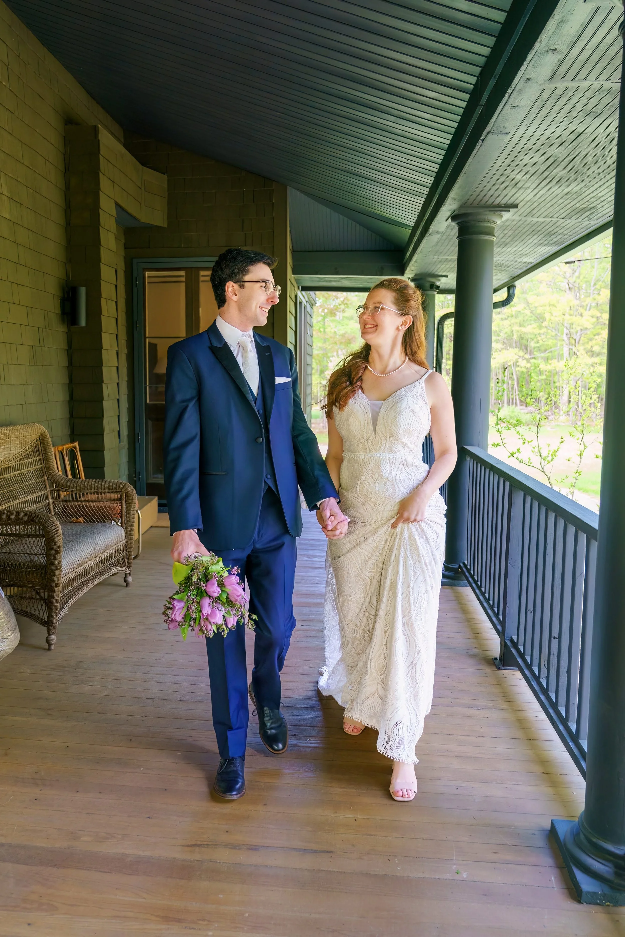A newlywed couple walking hand-in-hand on a porch, smiling at each other. The groom is in a blue suit holding a bouquet, and the bride is in a white lace dress.