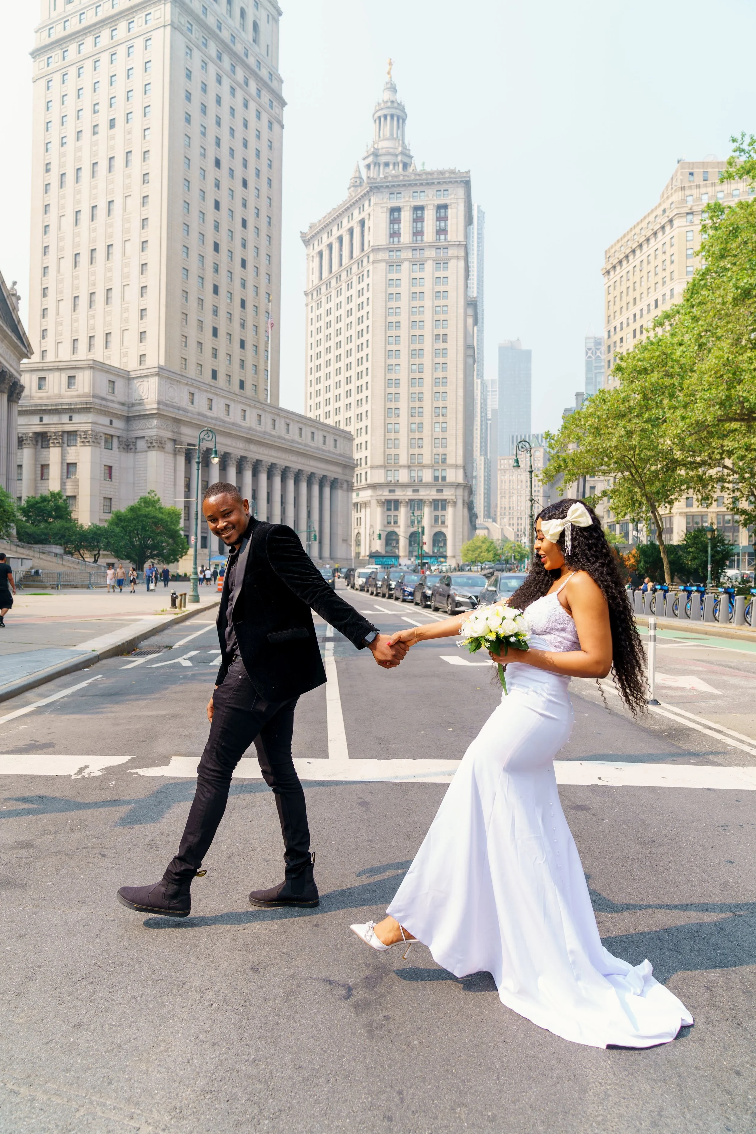 A bride and groom holding hands and walking on a city street, with tall buildings and trees in the background.