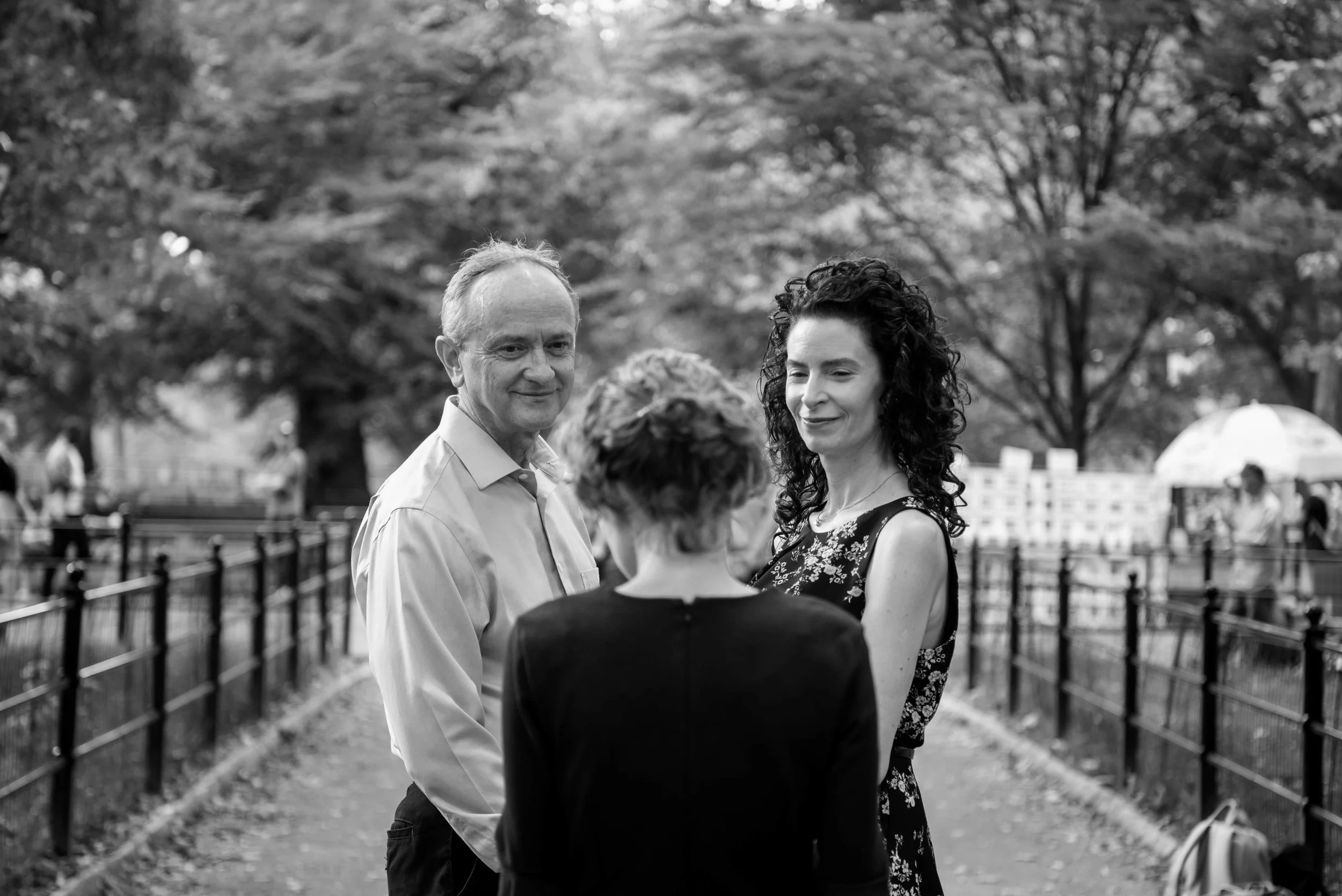 A black-and-white photo of an older couple getting married by their officiant in Central Park. The man on the left has light-colored hair and is wearing a button-up shirt. The woman on the right has dark curly hair and is wearing a floral dress.