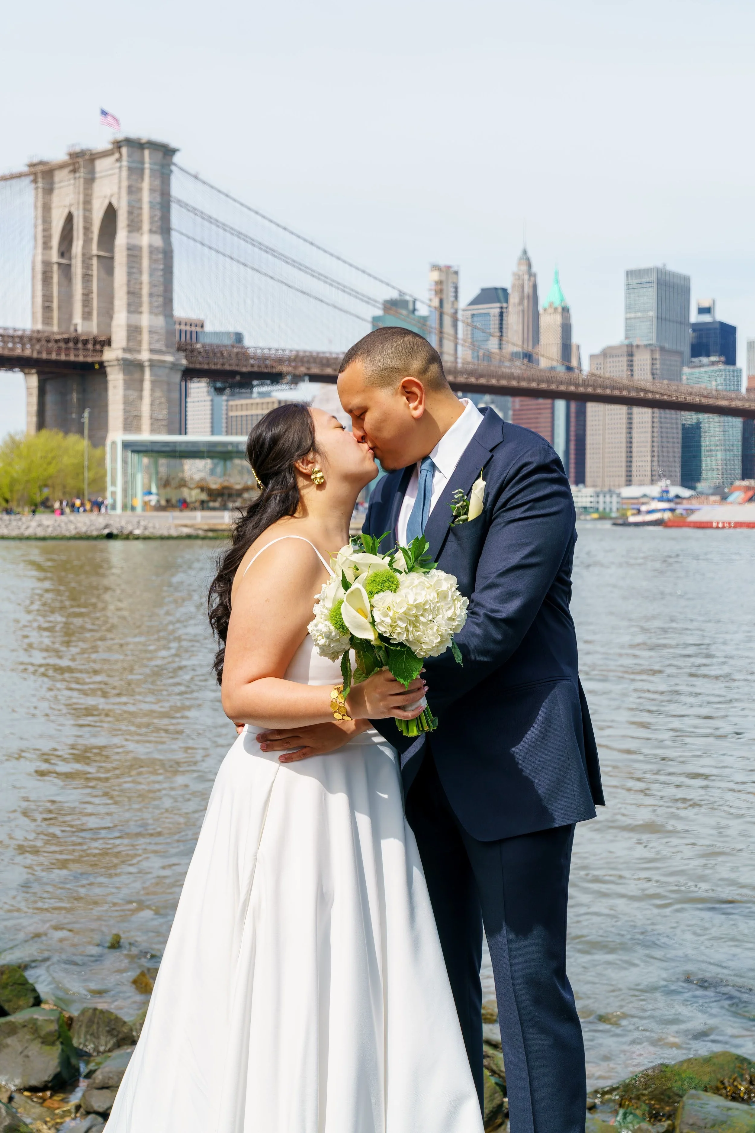 A newlywed couple kissing by the water with the Brooklyn Bridge and Manhattan skyline in the background.