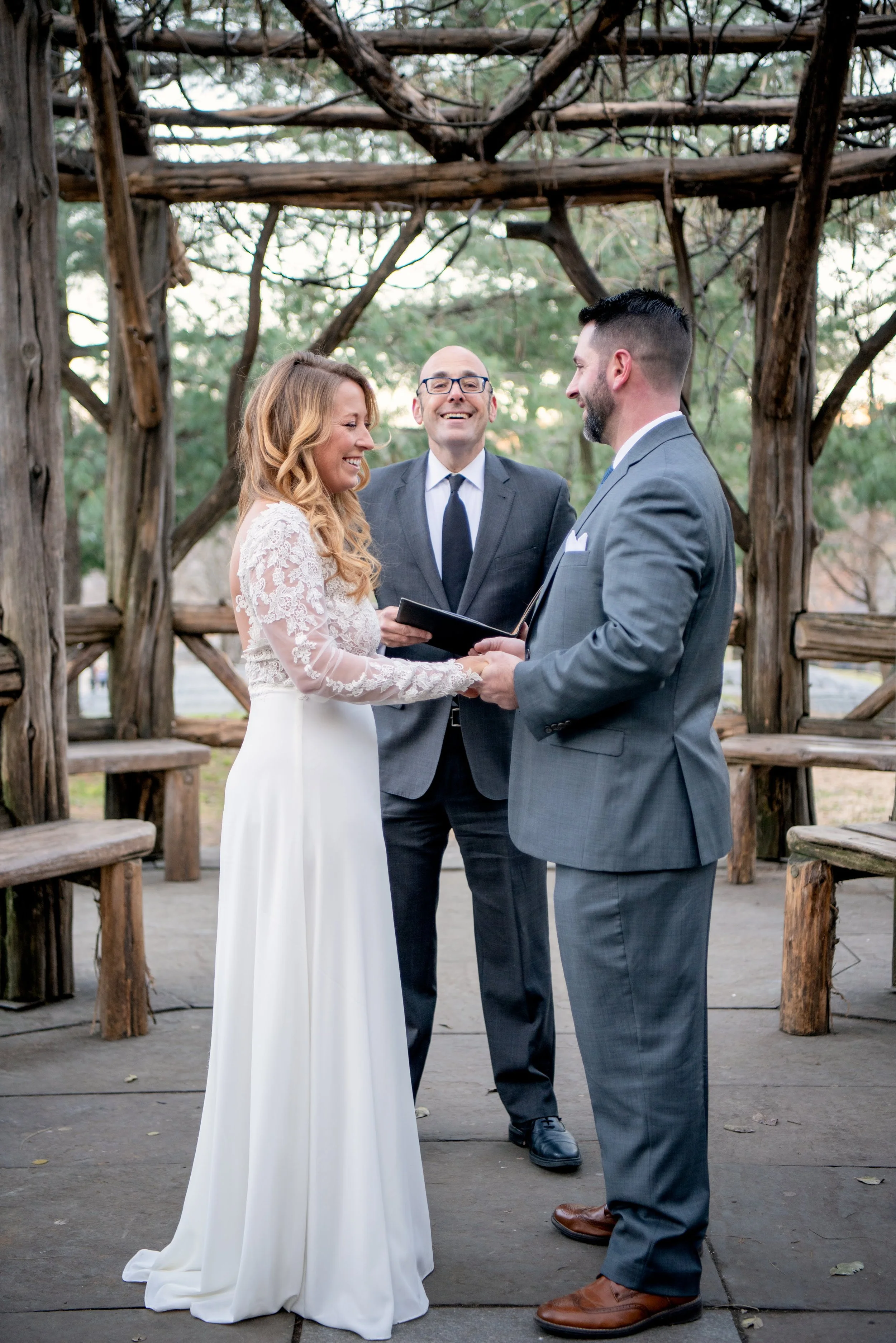 A couple getting married at the Cop Cot in Central Park, holding hands, with an officiant standing behind them. The bride wears a white lace wedding dress, and the groom wears a grey suit, both smiling. The setting features rustic wooden arch View fullsize