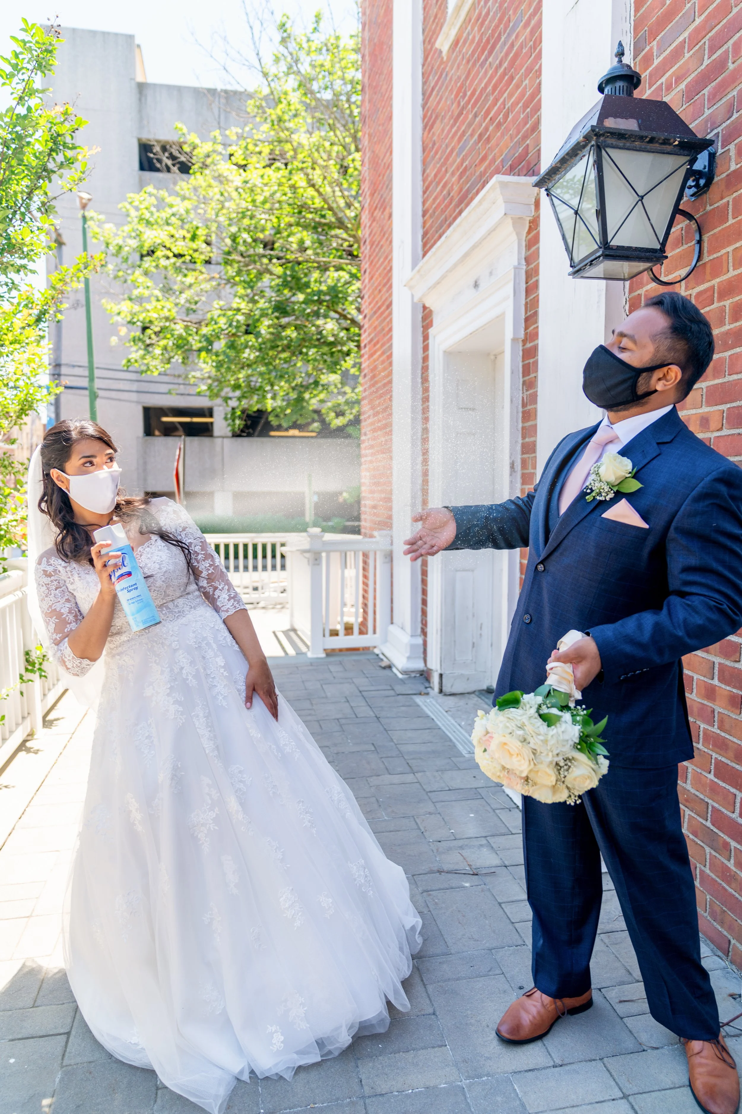 A bride in a white wedding gown and a bouquet in her hand stands outdoors wearing a face mask, aiming a can of Lysol at her groom, wearing a navy suit.
