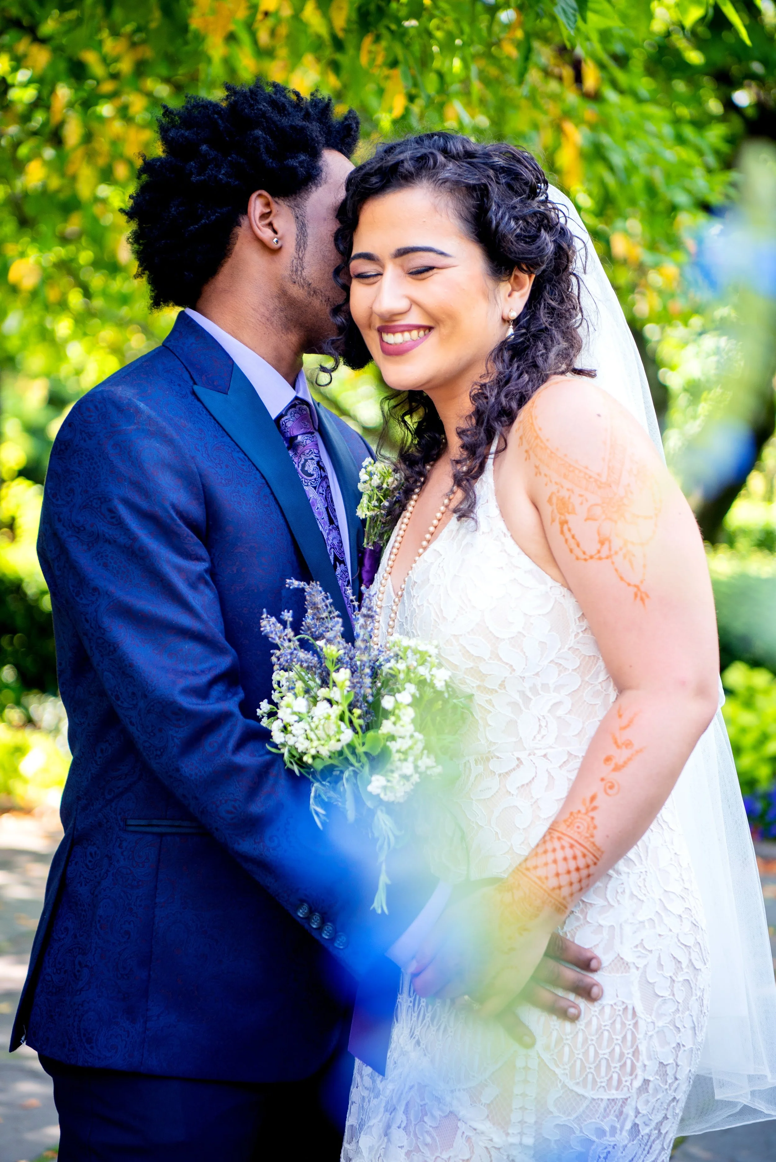A newly married couple sharing a joyful moment outdoors, with the groom whispering to the bride. The bride is wearing a white lace wedding dress, and the groom is dressed in a blue suit. The bride holds a bouquet of white and purple flowers, and has