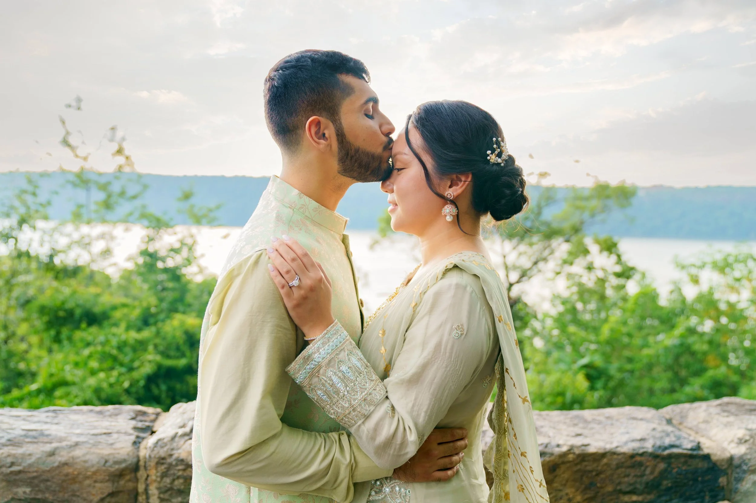 A couple dressed in traditional Afghan wedding attire sharing a tender moment outdoors with greenery and a lake in the background.