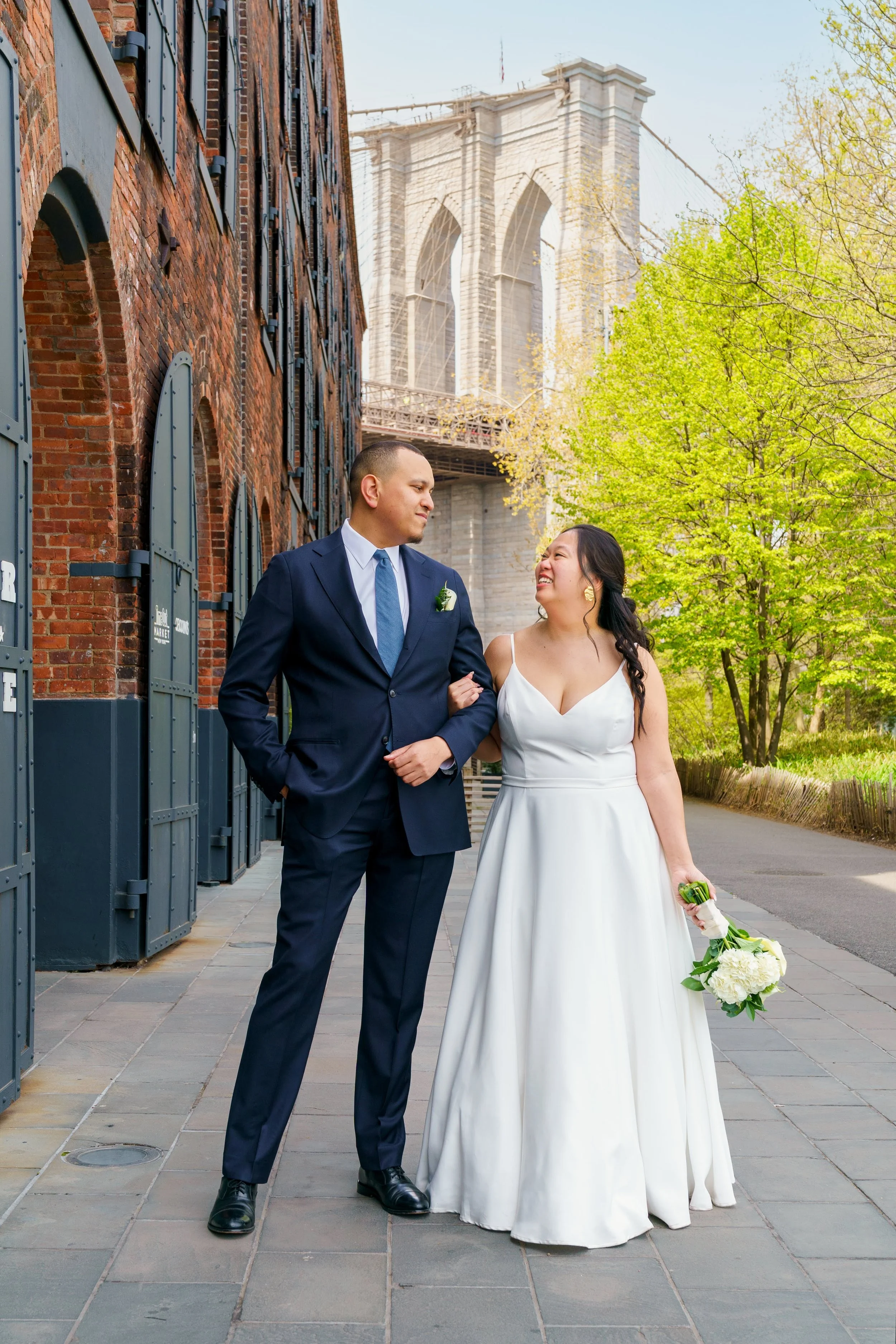 A bride and groom standing outside near a brick building and the Brooklyn Bridge in New York City. The bride is holding a bouquet of white flowers and is smiling at the groom. The groom is wearing a navy blue suit and a white shirt, looking at the br