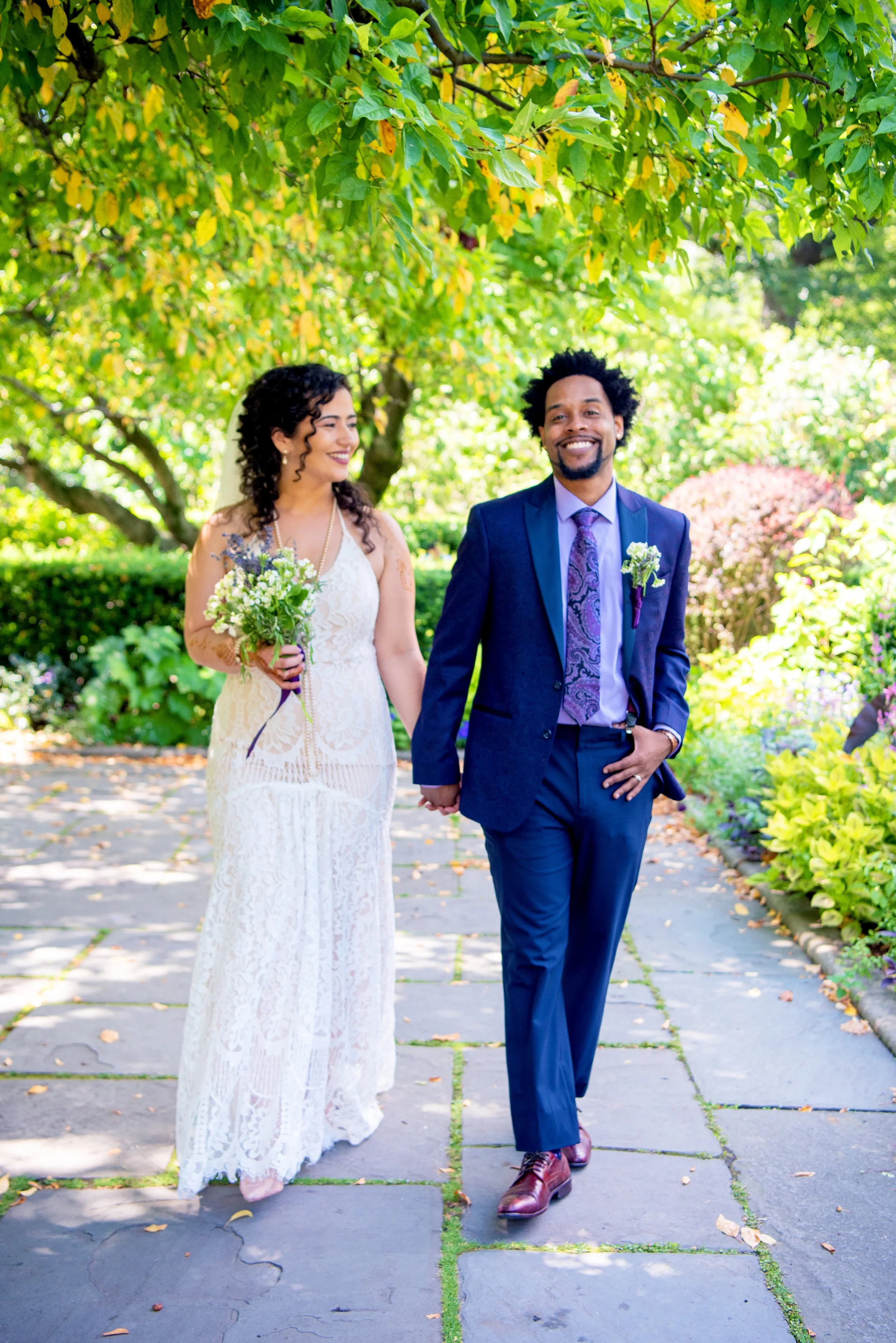 A bride and groom walking hand in hand outdoors in at the Conservatory Garden in Central Park, smiling and looking at each other, surrounded by green trees and colorful bushes. View fullsize