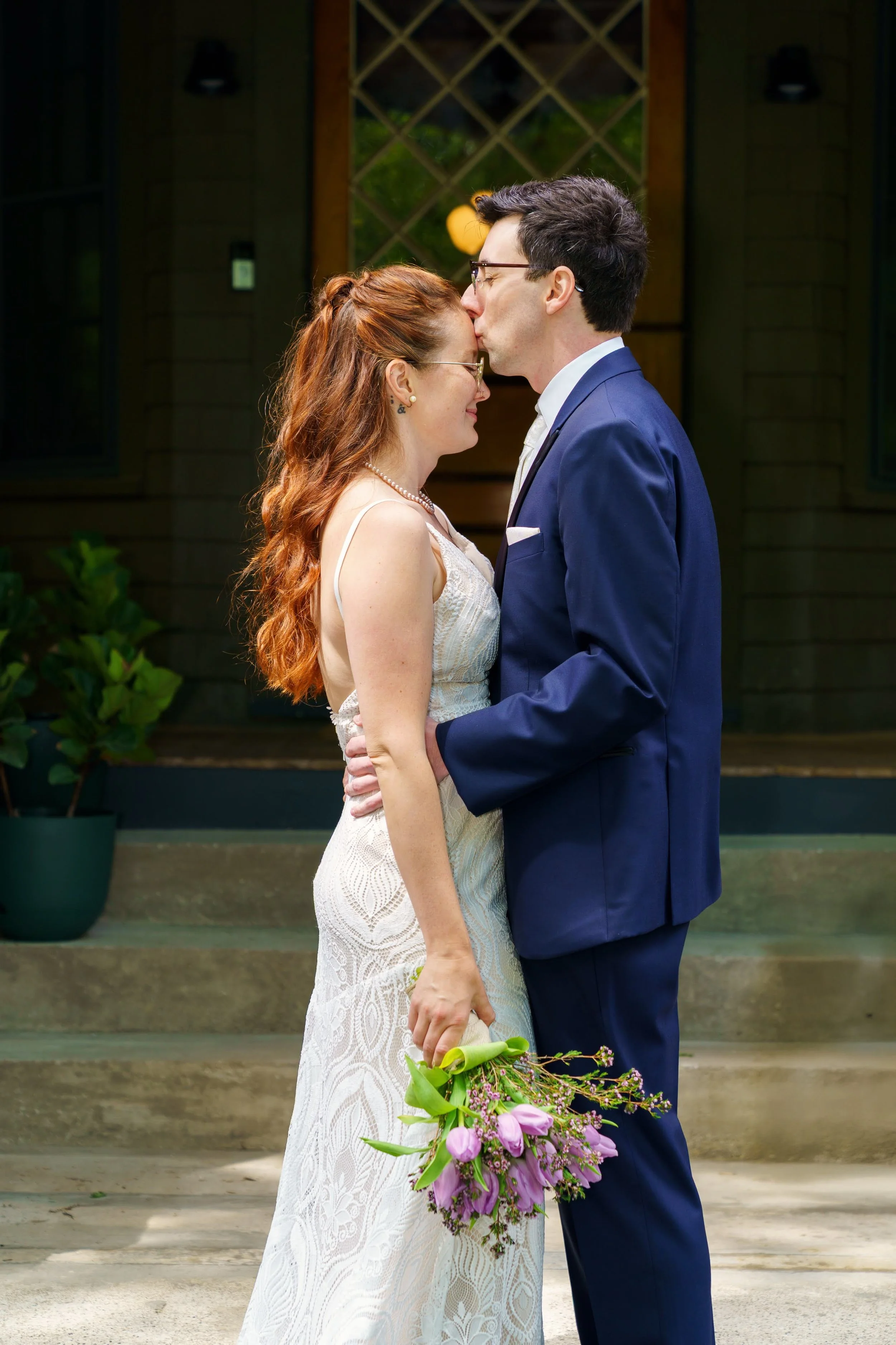 A bride and groom share a kiss outside, with the groom kissing the bride's forehead. The bride holds a bouquet of pink and purple flowers. They are dressed in wedding attire, standing on steps with a house and plants in the background.
